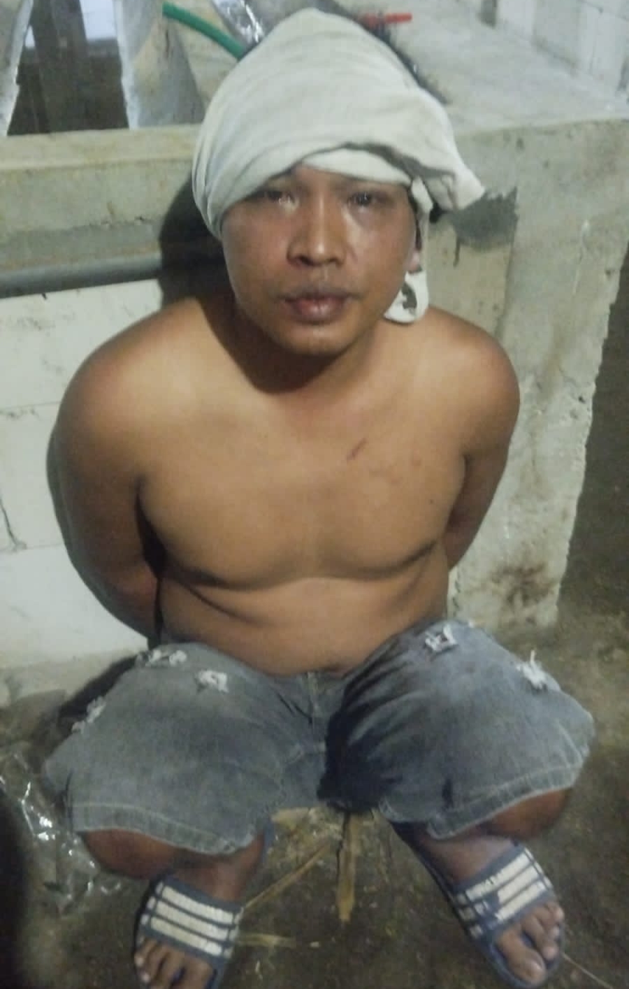 Foto: Edi Saputro, (posisi terikat, korban pengeroyokan mitra kerja Tomo), sebelum diselamatkan keluarga dari Jombang.