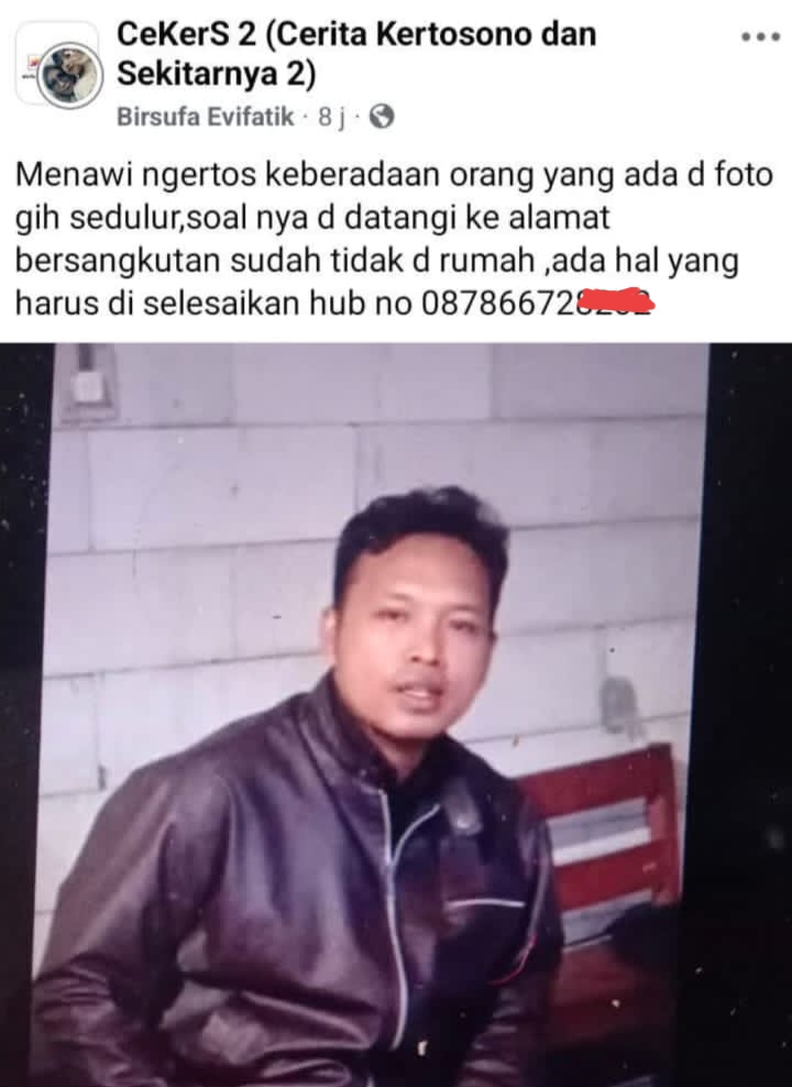 “Menawi ngertos keberadaan orang yang ada di foto gih sedulur, soalnya didatangi ke alamat bersangkutan sudah tidak di rumah. Ada hal yang harus diselesaikan. Hubungi nomor 0878667xxxx.”