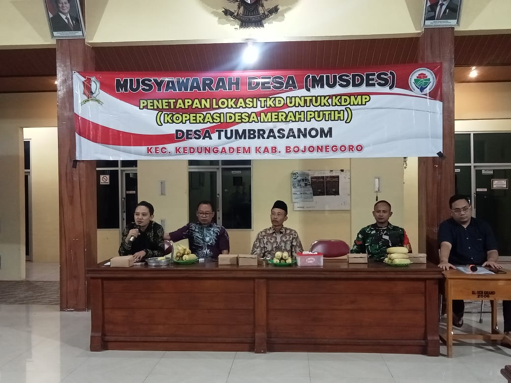 Musdes tersebut dihadiri oleh Pendamping Desa Kecamatan Kedungadem Yudi Firdaus, Kepala Desa Tumbrasanom Juminto, S.M., perangkat desa, perwakilan Koramil, Ketua RT/RW, Ketua BPD, pengurus Koperasi Merah Putih, tokoh agama, tokoh masyarakat, serta tamu undangan lainnya.