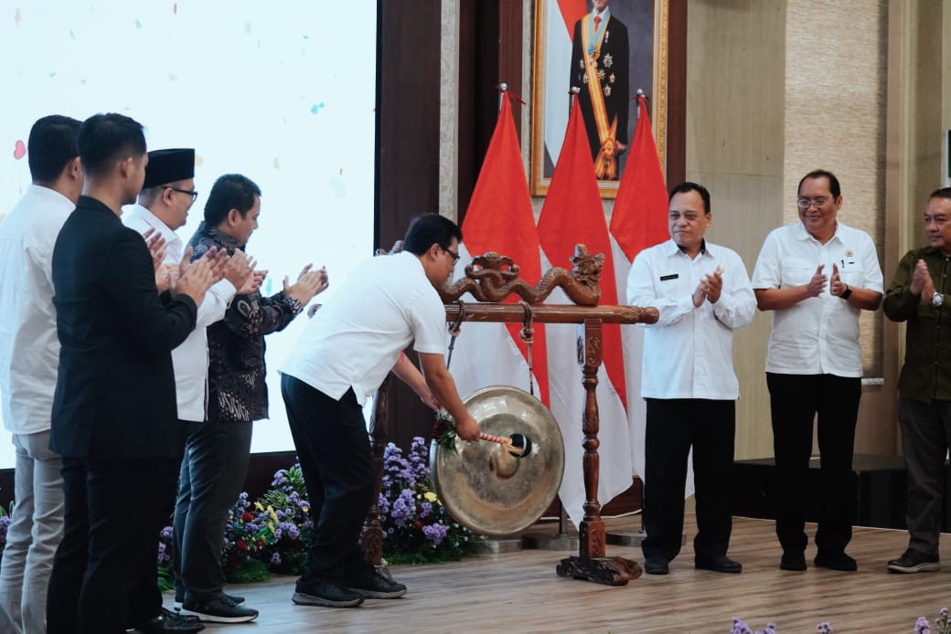 Sekda Kota Batu Zadiem Efisiensi saat menabuh Gong pertanda dibukanya “Pameran Perumahan dan Perizinan” di Balaikota Among Tani Kota Batu. (Ist)