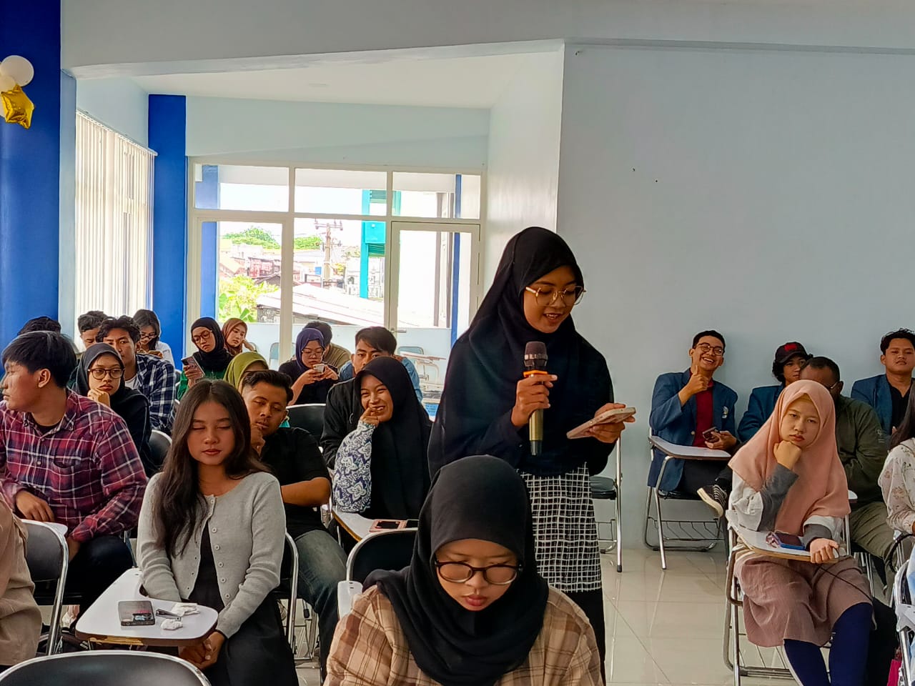 Acara semakin hidup dengan adanya sesi tanya jawab interaktif. Para mahasiswa antusias mengajukan berbagai pertanyaan seputar peluang beasiswa, cara mengatasi hambatan dalam penelitian, hingga strategi mengelola waktu antara studi dan aktivitas personal. Dimas pun menjawab dengan lugas dan inspiratif, sehingga menciptakan suasana diskusi yang hangat, mendalam, sekaligus memotivasi.
