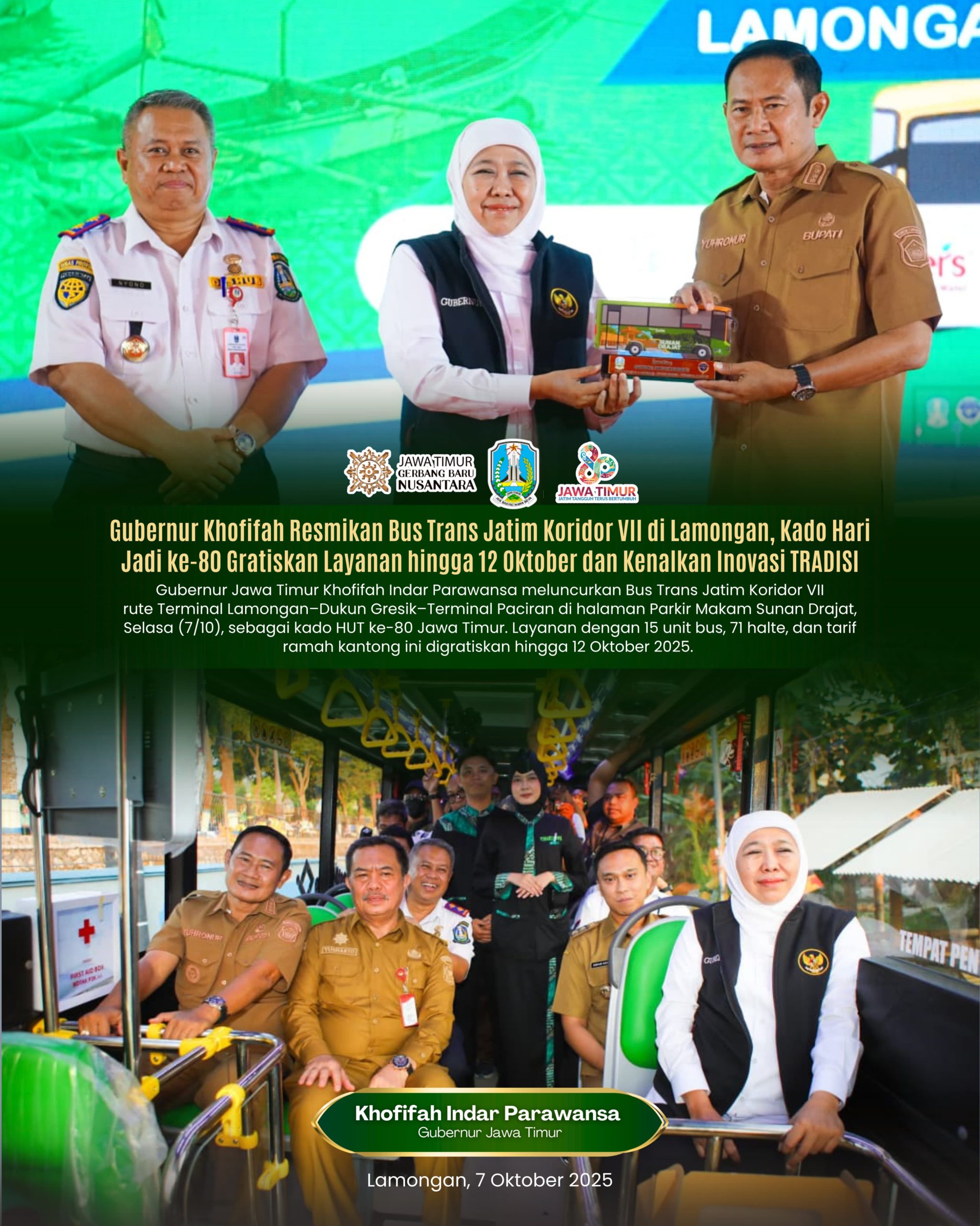 Selain itu, nama yang diusung dalam Koridor VII, yakni Trans Jatim Sunan Drajat, memiliki nilai spiritual dan historis. Artinya, layanan membawa keberkahan bagi seluruh masyarakat Jawa Timur, khususnya momentum Hari Ulang Tahun ke-80 Provinsi Jawa Timur.