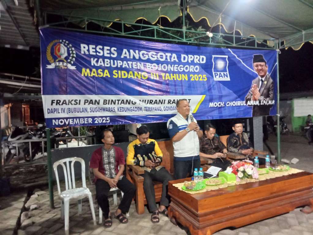 Kabarjagad, Bojonegoro – Anggota DPRD Kabupaten Bojonegoro dari Fraksi PAN Bintang Nurani Rakyat (PAN BNR), Moch. Choirul Anam, S.Pd., M.AP., menggelar Reses Masa Sidang III Tahun 2025 di kediamannya di Dusun Demping, Desa Dayukidul, Kecamatan Kedungadem, pada Jumat malam (21/11). Acara tersebut dihadiri jajaran pengurus DPD PAN Bojonegoro, kader PAN Kedungadem, relawan, tokoh masyarakat, dan tokoh agama.