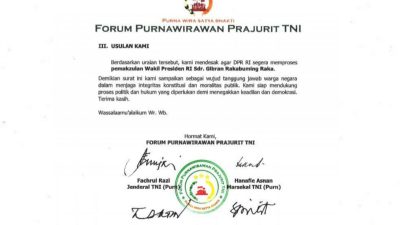 Isi surat dari Forum Purnawirawan Prajurit TNI yang disampaikan kepada DPR dan MPR RI. (Ist)…