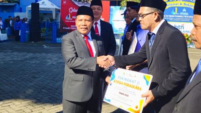 Dirut Perumda Tirta Kanjuruhan, H. Syamsul Hadi saat memberikan penghargaan kepada Unit Pelayanan Perumda Tirta…