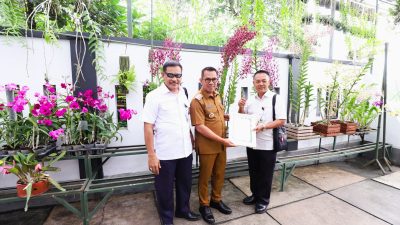 Kabarjagad, Kota Batu – Wali Kota Batu Nurochman, menyerahkan bunga anggrek spesies langka sebagai cindera…