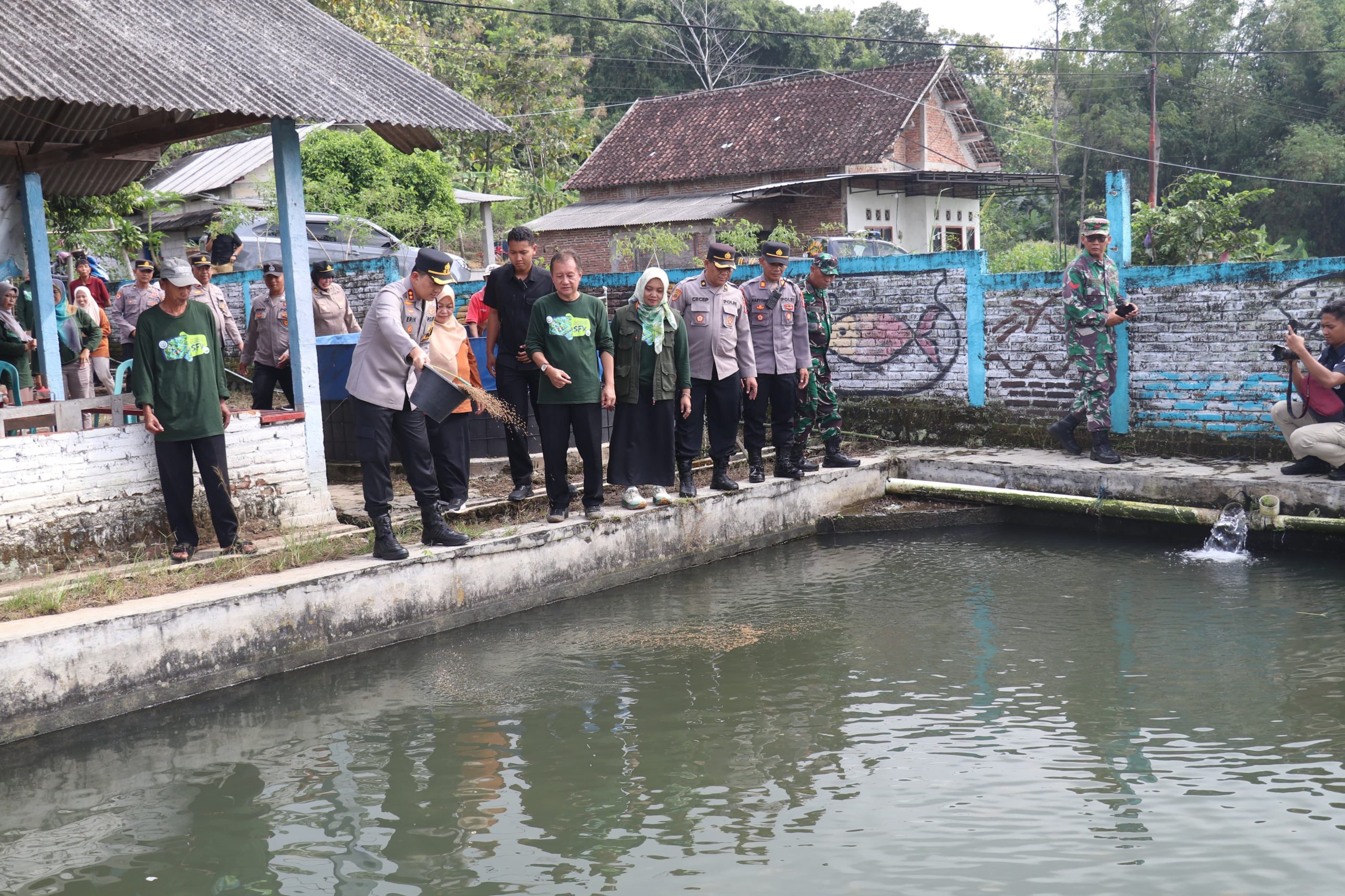 Kapolres Magetan bersama rombongan memulai kegiatan dengan meninjau kolam pembesaran ikan nila milik Badan Usaha Milik Desa (BUMDes) Sumberdodol, sebagai bagian dari pengembangan Kampung Perikanan Budidaya di wilayah tersebut.