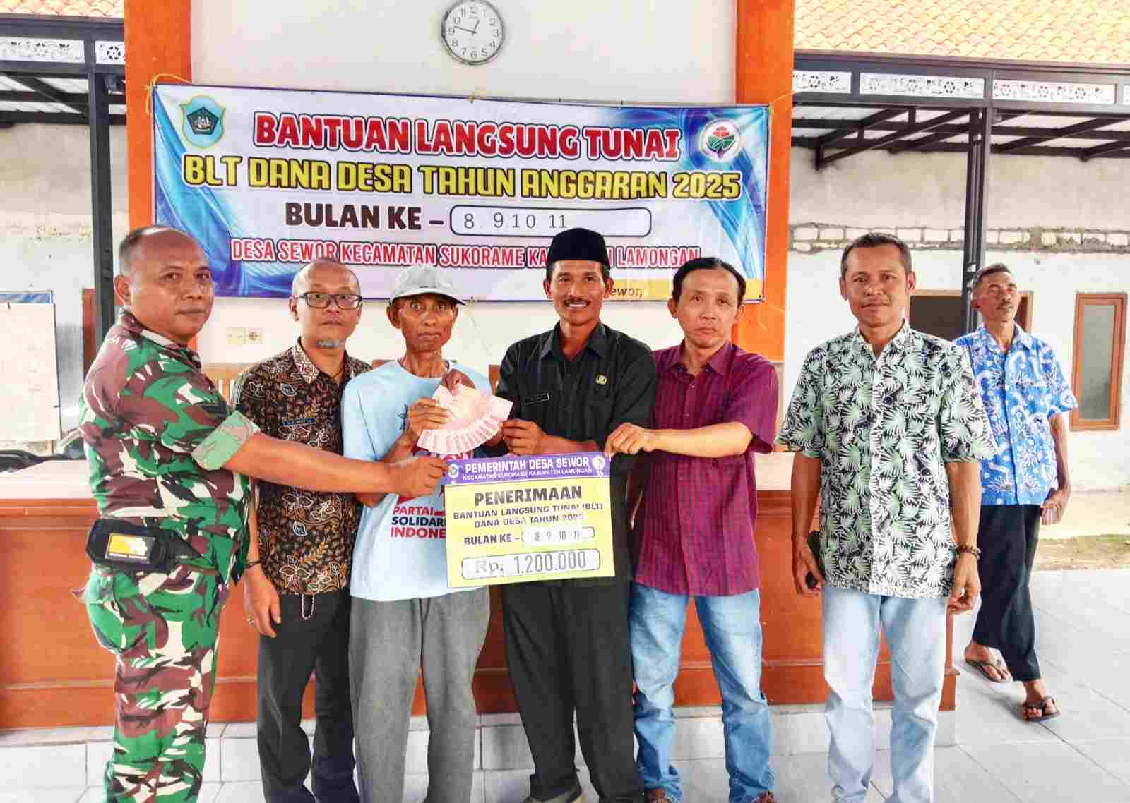 Bertempat di Balai Desa Sewor, Kecamatan Sukorame, Lamongan, Sertu Eko Suryono, Babinsa Koramil 0812/24 Sukorame bersama Bhabinkamtibmas melaksanakan pendampingan aktif pada kegiatan penyaluran Bantuan Langsung Tunai Dana Desa (BLT DD), Jumat (21/11/2025).