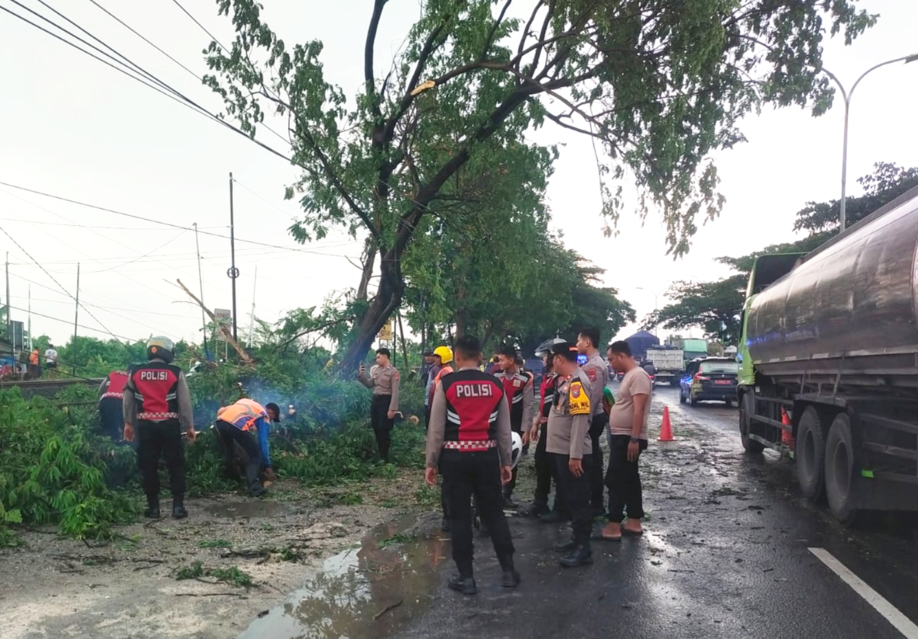 Petugas bergotong royong memotong dan menyingkirkan batang pohon yang melintang di jalan, sekaligus melakukan pengaturan arus lalu lintas guna mencegah terjadinya penumpukan kendaraan.