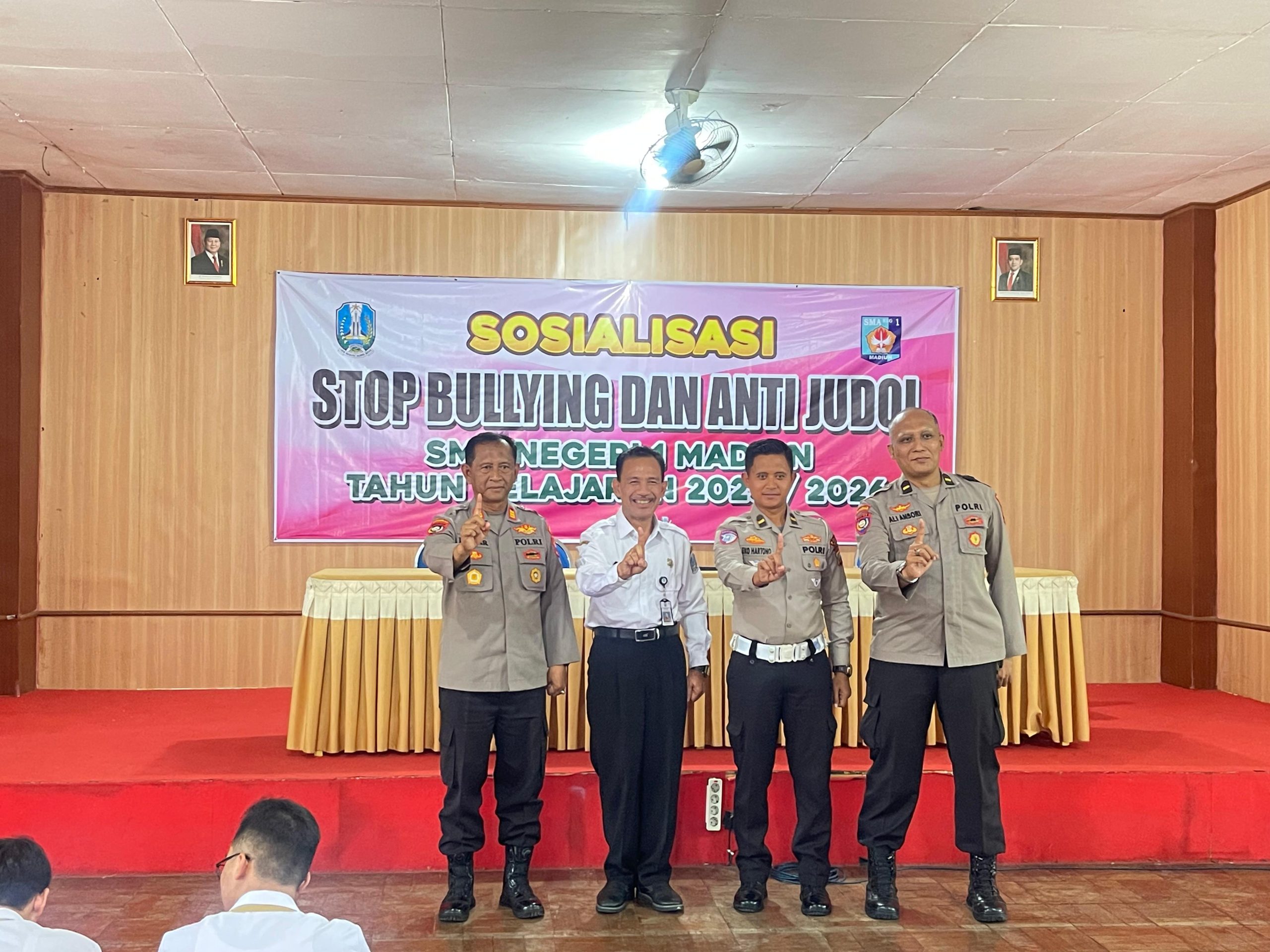 Kabarjagad, Madiun – Satbinmas Polres Madiun Kota menggelar sosialisasi bertema Stop Bullying dan Anti Judi Online di SMA Negeri 1 Madiun, Rabu (20/8/2025). Kegiatan yang berlangsung di aula sekolah ini diikuti siswa-siswi kelas XI.